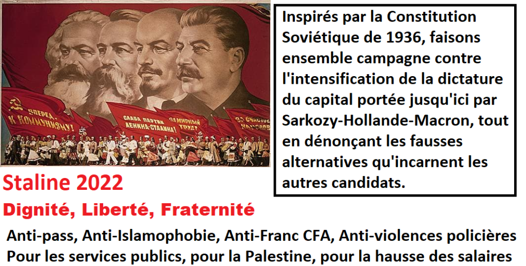Il existe des considérations générales anciennes analysant l’impasse de l’électoralisme et du réformisme qui disqualifient l’orientation stratégique globale de partis comme le PCF et la France Insoumise. Cela dit, nous saluons le courage de nombre de militants de base (héritiers de la grande époque du Parti Communiste) qui sont les bienvenus ici si ils sont capables de reconnaître les errements de leur direction. Les fanatiques du PCF et de LFI ne sont pas les bienvenus ici, de même que les fanatiques des Gilets Jaunes qui sont agressifs envers la CGT par principe ou les fanatiques de la CGT agressifs envers les Gilets Jaunes par principe ou certains anti-pass sanitaires minoritaires qui venaient agresser mon ami car il venait manifester contre le pass sanitaire en portant son masque. Ne confonds pas tout, dialoguons dans le respect de chacun.